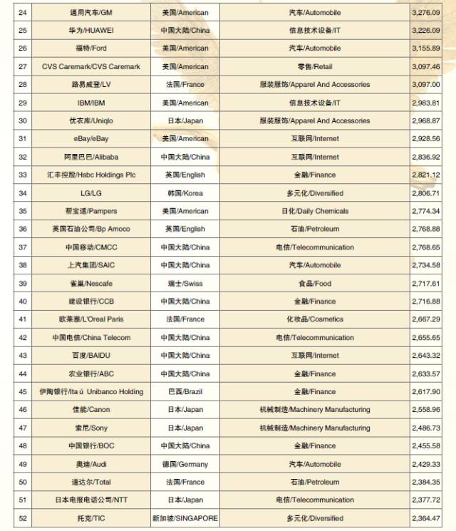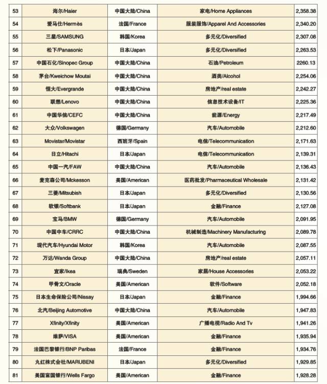 Under such a general background, Asiabrand, on the basis of the national standard and according to the ABAS brand value evaluation system, selected 500 enterprises with the highest brand value among many brands around the world - “2017 Top 500 World Brands Ranking ", the total value of the brands on this list reaches about 69.51 trillion, and the 500 brands on the list are from 31 countries, including the United States, China, Japan, France, Germany and the United Kingdom. Among them, there are 175 brands from the United States, occupying 35.00% of the whole list, occupying the first position of the whole list of brands on the list, and the number of brands on the list is far ahead, with a total value of about 25.44 trillion, accounting for about 36.60% of the total value of the list; 97 brands from China are on the list (including Hong Kong, Macao, and Taiwan), occupying 19.4% of the total list, and ranked second, with a total value of about 14.24 trillion, accounting for 20.49% of the total value of the list; France ranked third in the number of top 500 brands on the list, with 33 brands on the list, with a total value of about 4.76 trillion, accounting for about 6.85%; Japan has 32 brands on the list, ranking fourth, with a total value of about 5.63 trillion, accounting for 8.01%. It is worth mentioning that this time the number of Japan did not enter the top three, but its total value of the top 500 brands was higher than that of France, ranking third.